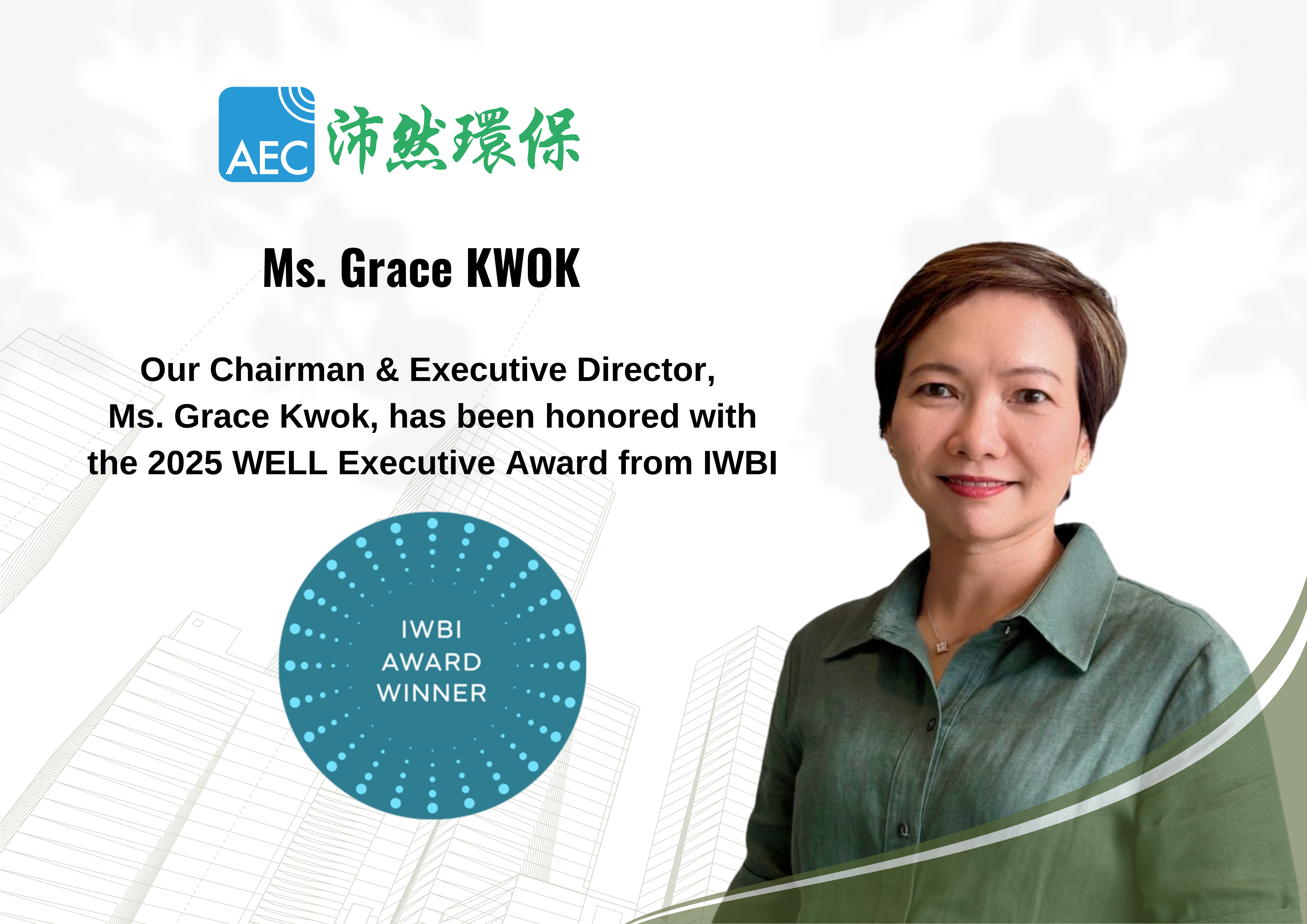 It is with great pride that AEC announces our Chairman and Executive Director, Ms. Grace Kwok, has been honored with the 2025 WELL Executive Award by the International WELL Building Institute (IWBI).