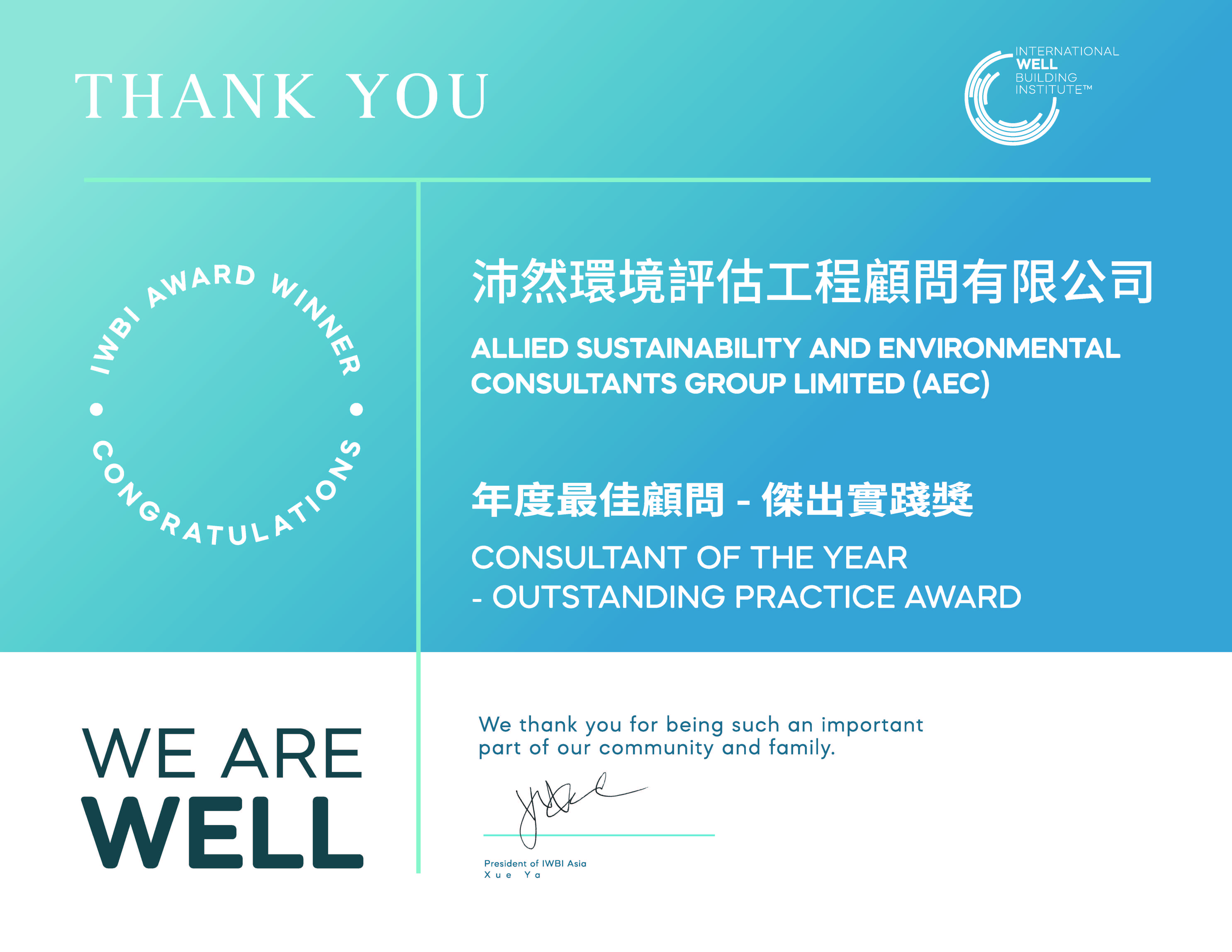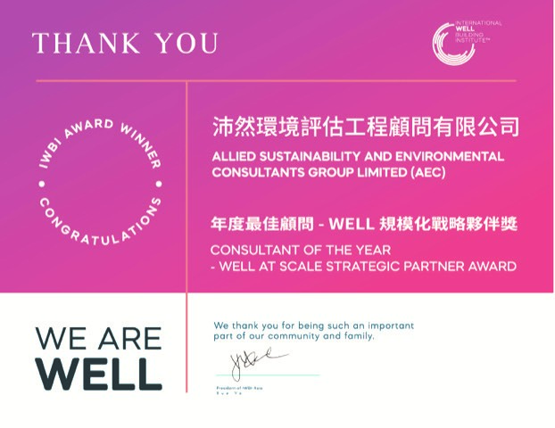 It is with great pride that AEC announces our Chairman and Executive Director, Ms. Grace Kwok, has been honored with the 2025 WELL Executive Award by the International WELL Building Institute (IWBI).