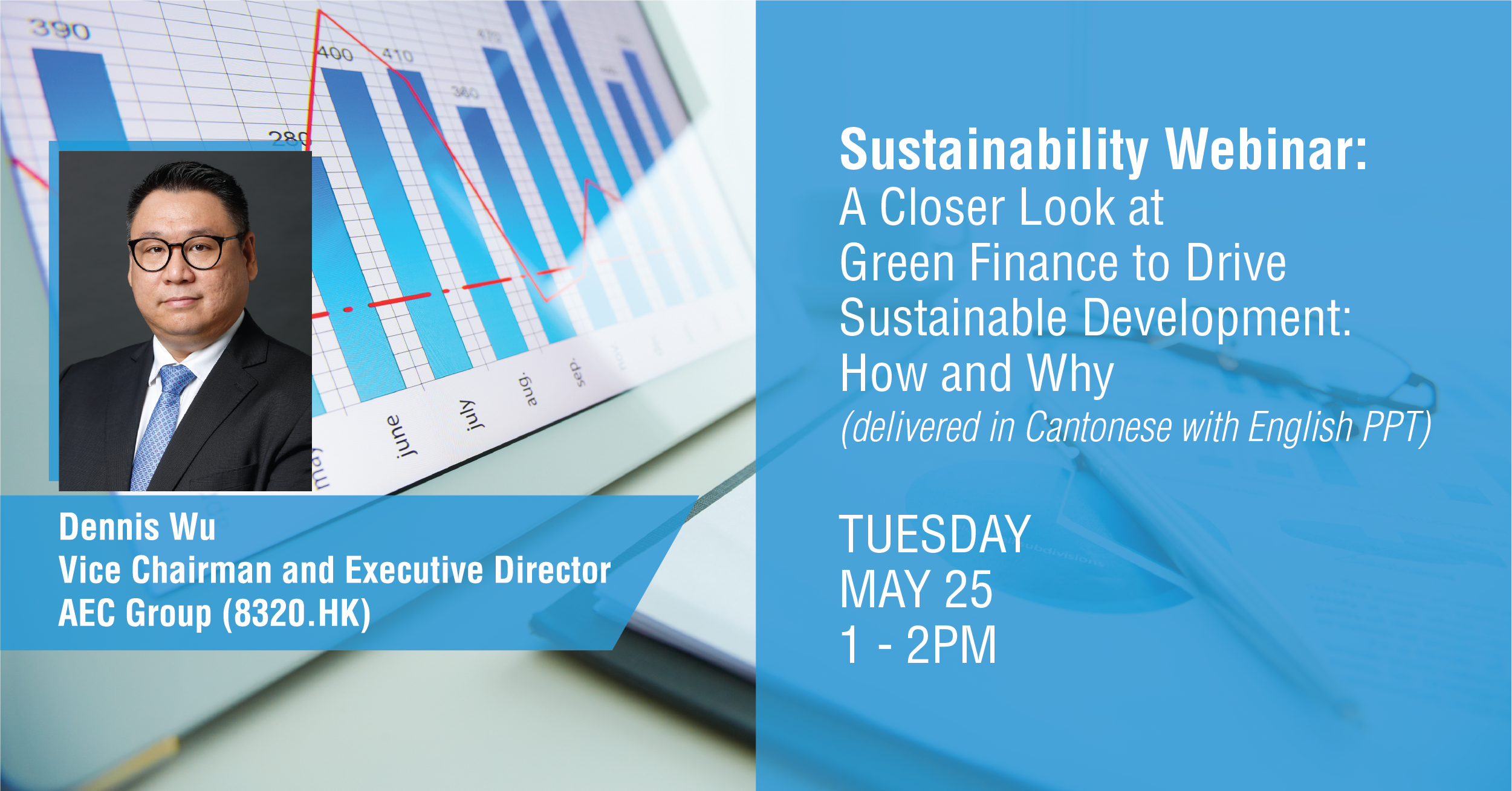 Mr Dennis Wu, Vice Chairman and Executive Director of AEC Group, will be speaking at the Sustainability Webinar organized by the Hong Kong Women Professionals and Entrepreneurs Association (HKWPEA) on 25 May (Tue), bringing us “A Closer Look at Green Finance to Drive Sustainable Development: How and Why”, and exploring how businesses from diverse industries could leverage green finance and mobilize capital for green and impact investments to achieve sustainable business goals. It’s free – sign up now.